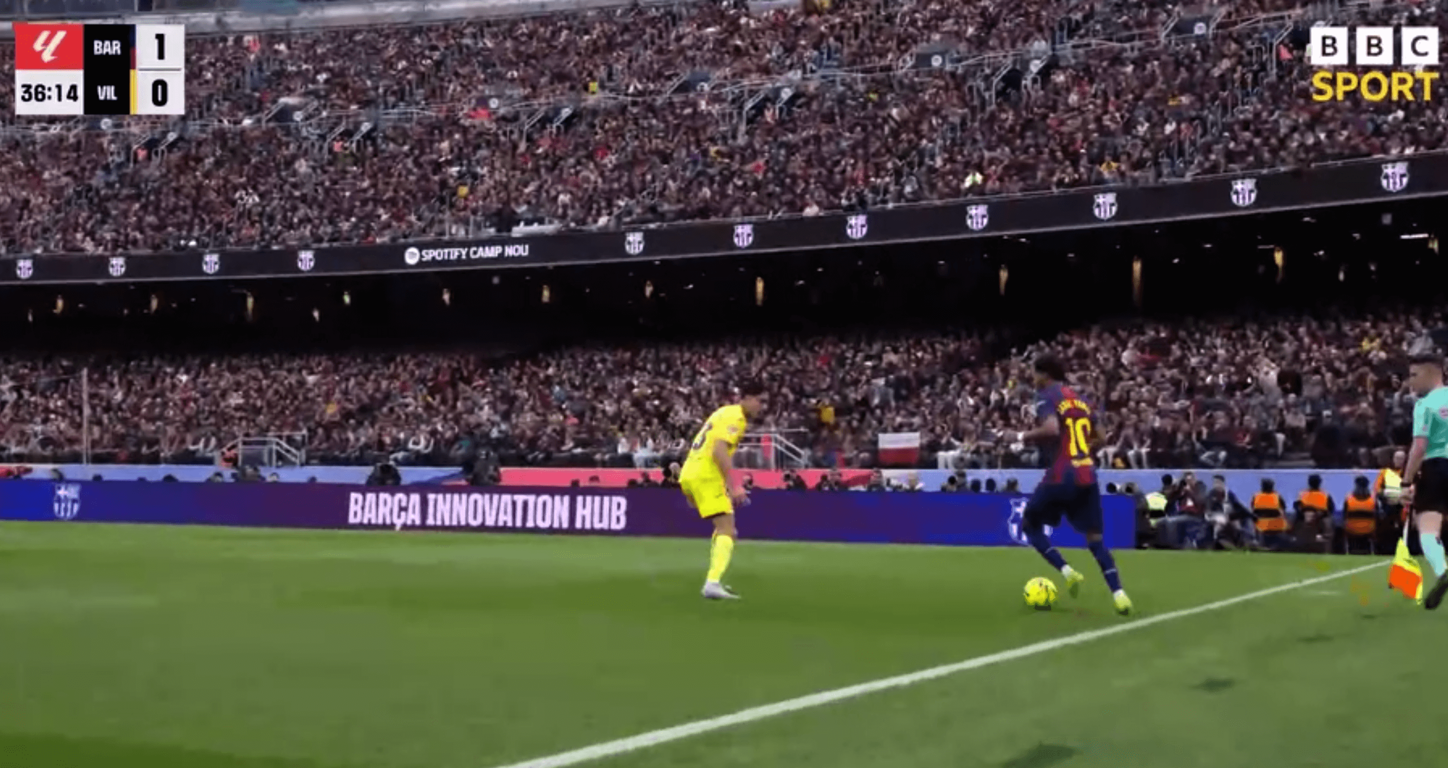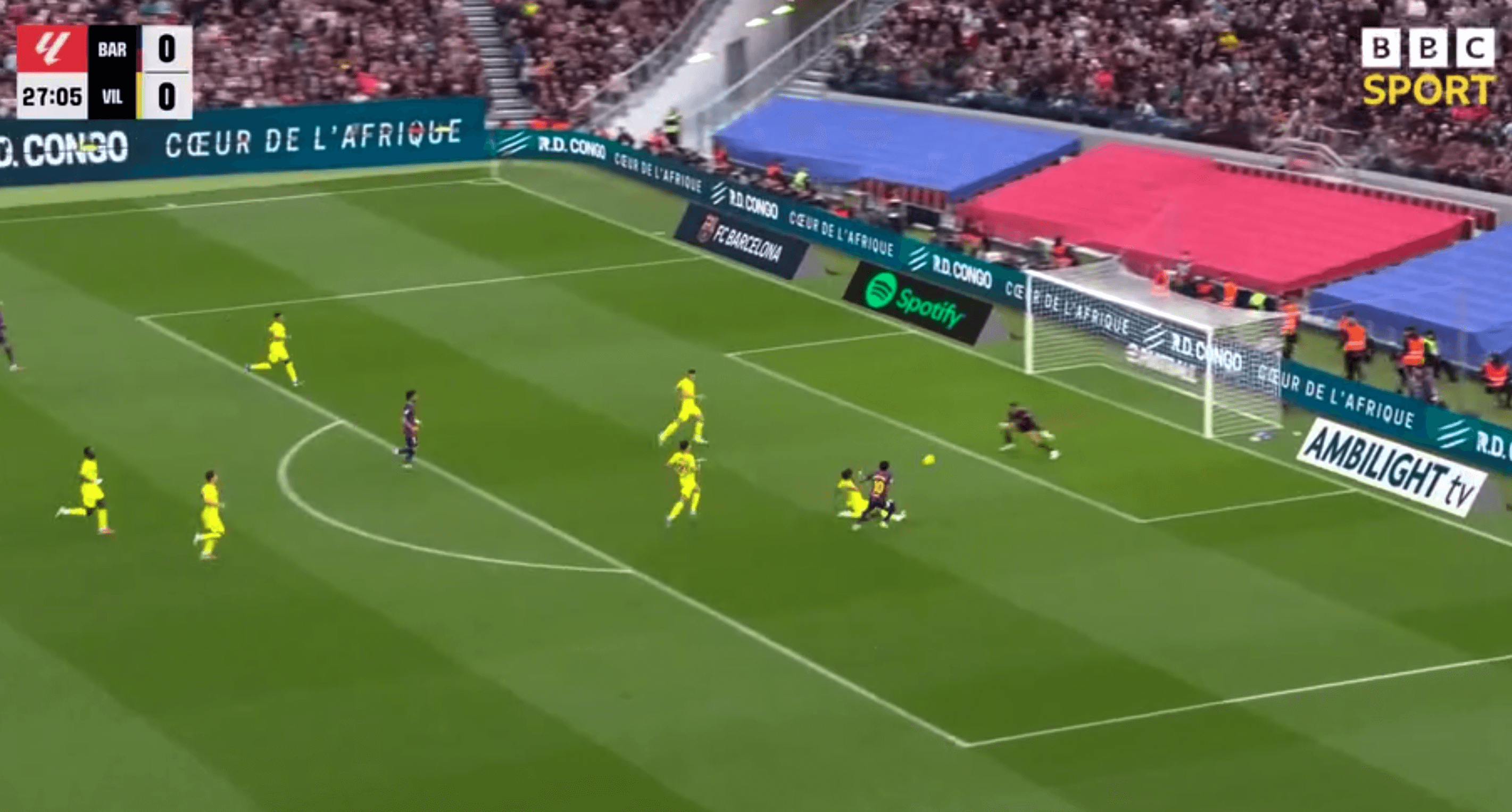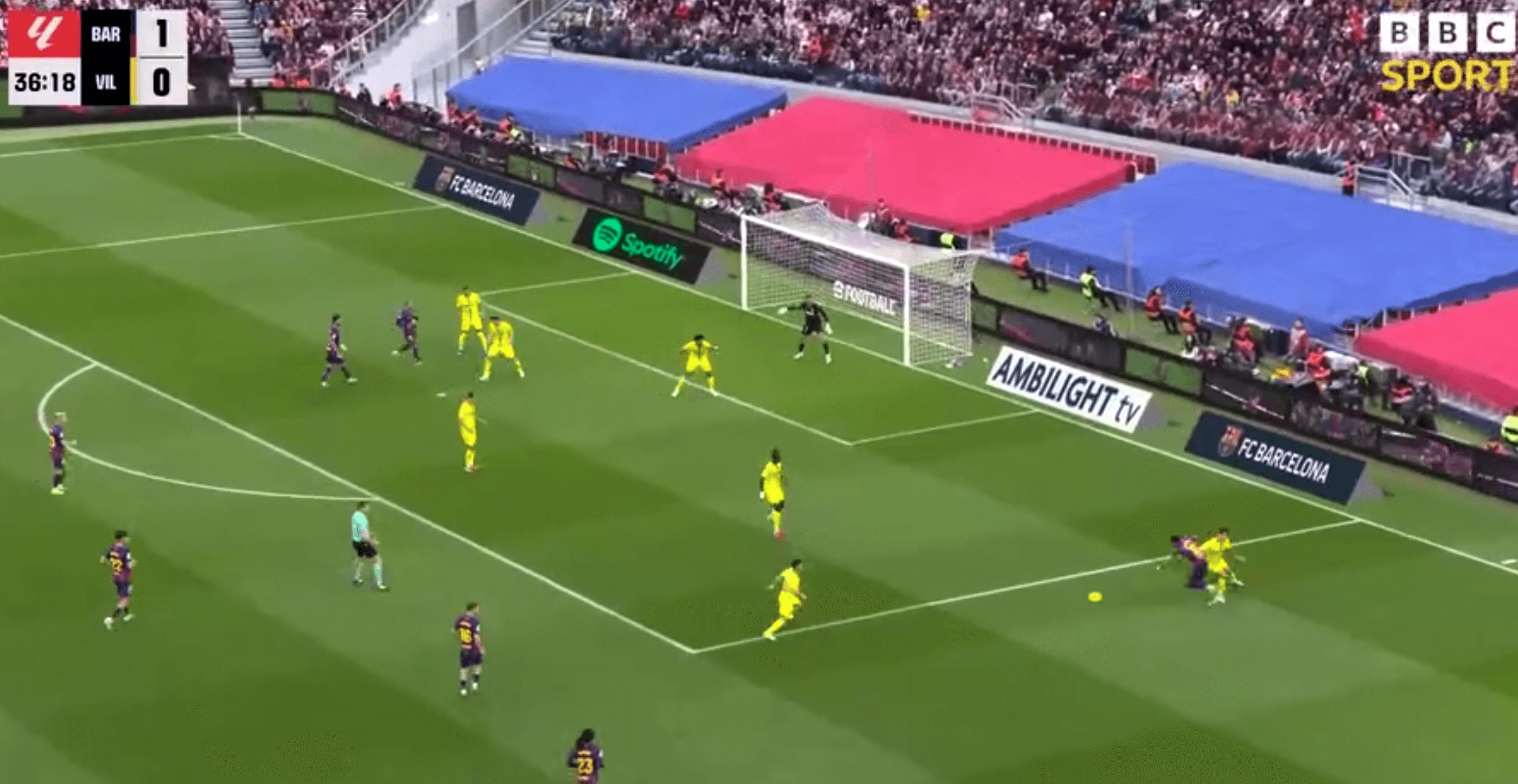 Yamal remató con el exterior de su pie izquierdo, llevándolo al área penal donde se encontró con el portero del Villarreal, Luis Junior.