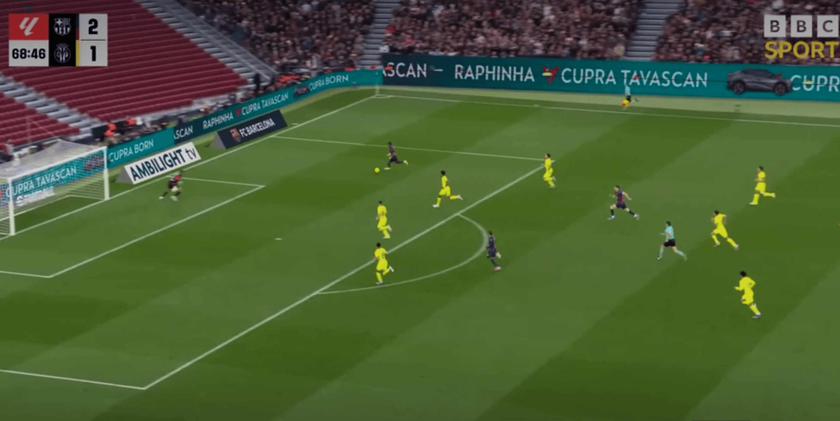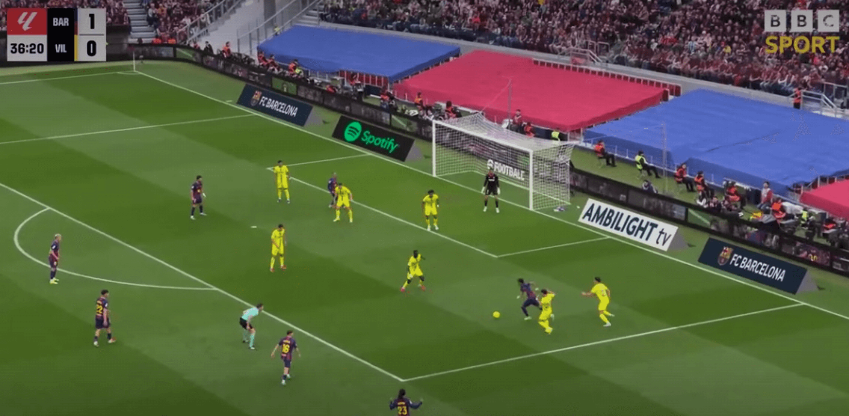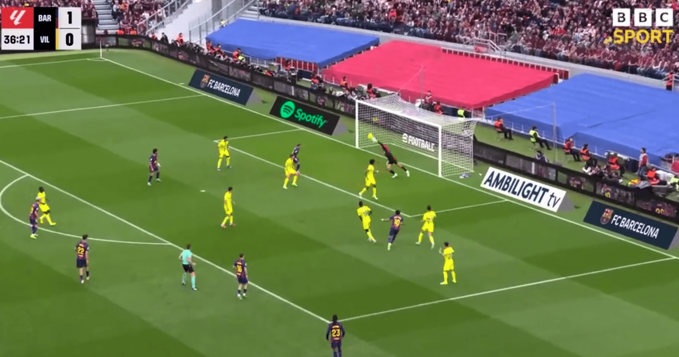 Yamal remató con el exterior de su pie izquierdo, llevándolo al área penal donde se encontró con el portero del Villarreal, Luis Junior.