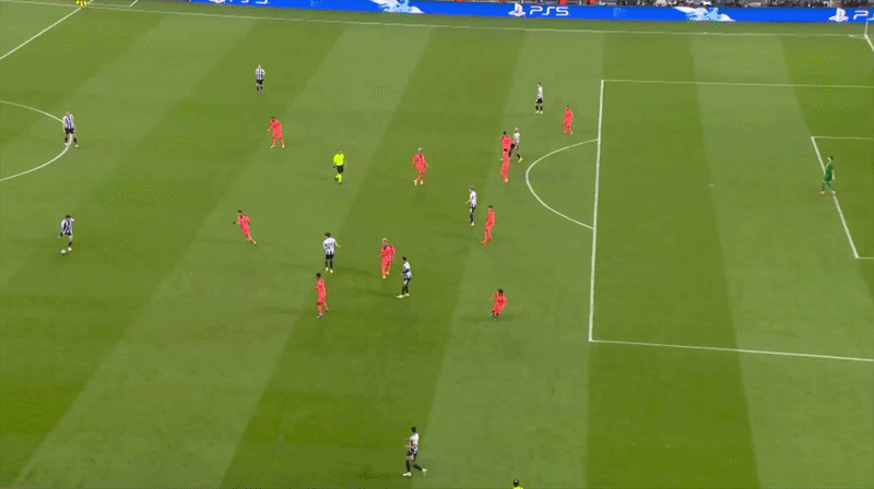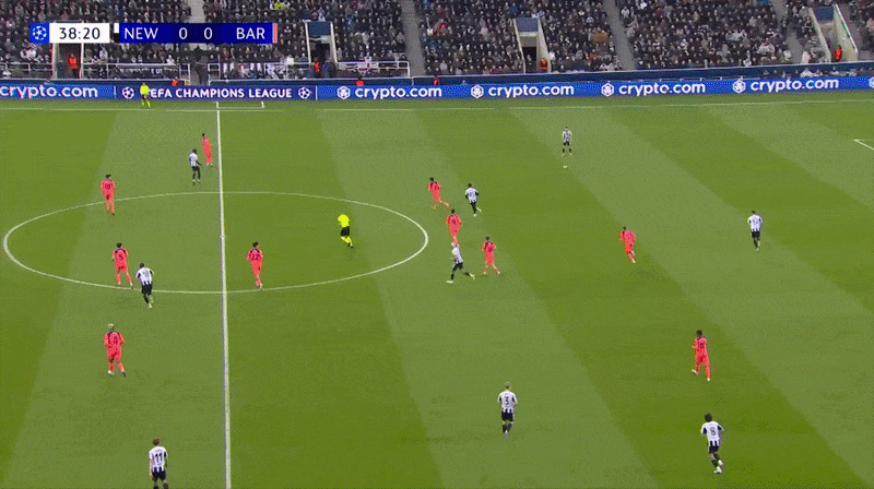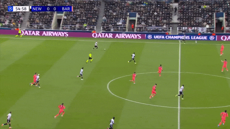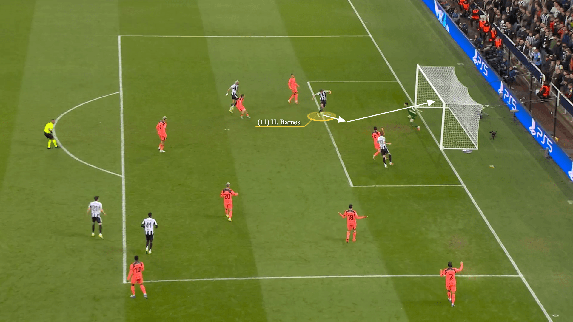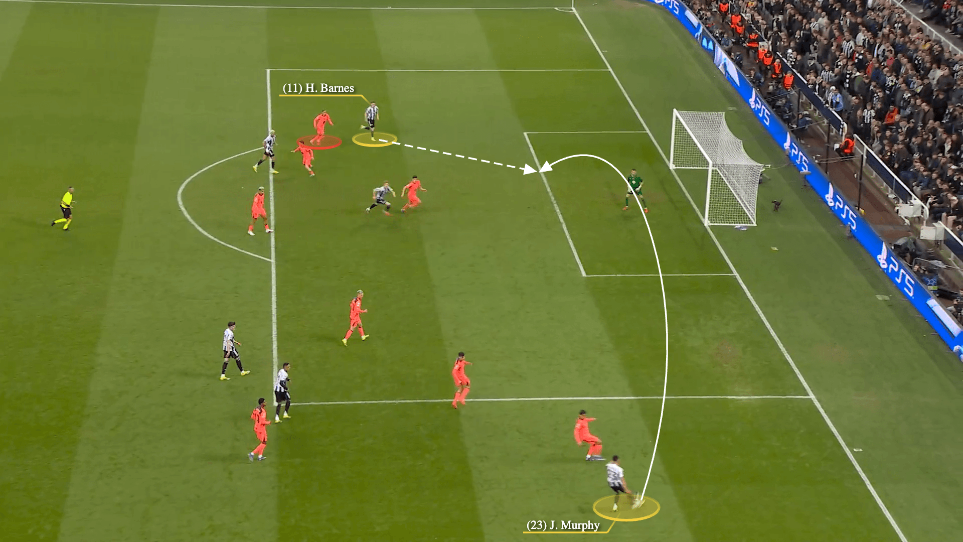 Otro aspecto del juego de ataque del Newcastle que causó problemas al Barcelona fue el enfoque en atacar el poste trasero y posicionarse en el lado ciego de los defensores del Barcelona al cruzar. Esto permitió al delantero del Newcastle en el segundo palo ver a tres o cuatro defensores y ajustar su posición para permanecer en el juego.
