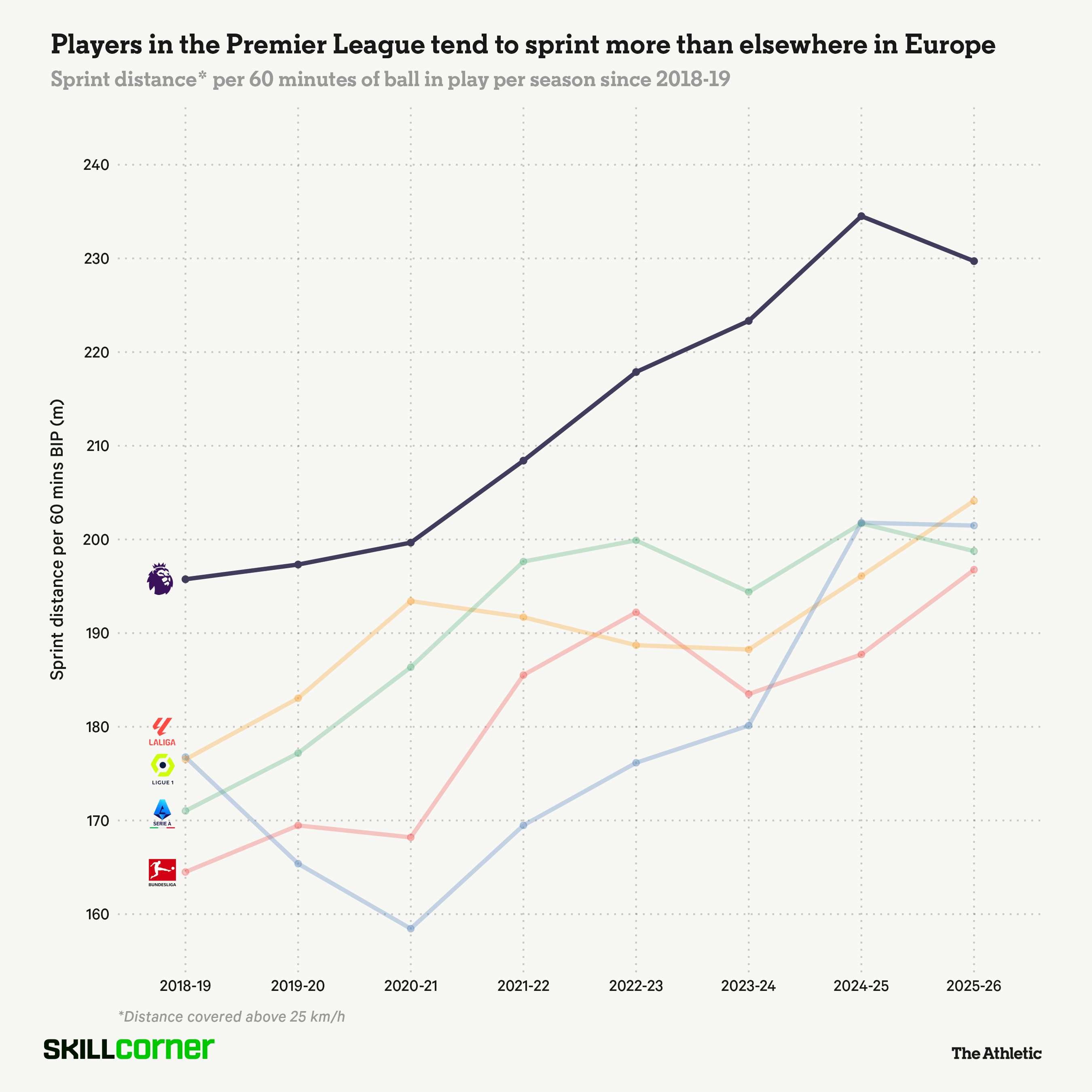 Si bien la Serie A es generalmente comparable a la Ligue 1, la Bundesliga y la Liga en términos de velocidad, ha estado aproximadamente al mismo nivel durante los últimos cinco años, mientras que otras ligas se han vuelto más rápidas.