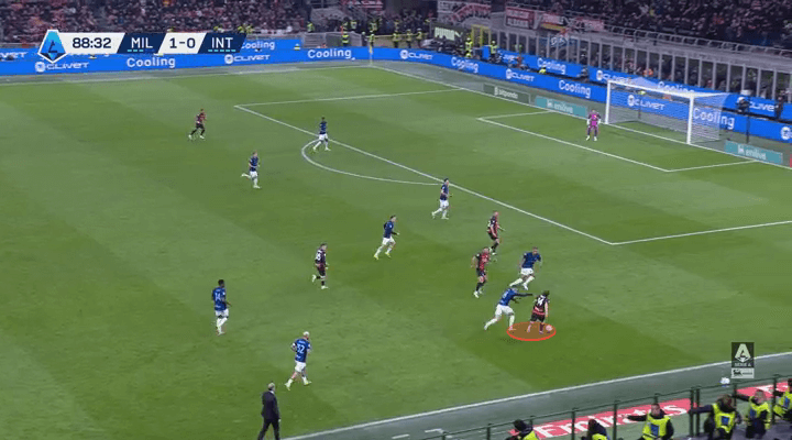 El fútbol italiano existe ahora en su pequeño mundo. En ninguna otra liga importante habrías visto a los dos delanteros alineados en sistemas 3-5-2, una batalla de formación que siempre parece limitante. Ambas defensas tienen un hombre de respaldo. El centro del campo está congestionado, aunque el mediocampista más profundo generalmente puede encontrar espacio para dictar el juego. Los laterales pasan gran parte del juego persiguiéndose unos a otros por las líneas de banda. La batalla táctica en San Siro consistió en que ambos lados intentaban crear una sobrecarga empujando hacia adelante a un central abierto para apoyar a un lateral y luego cruzando.