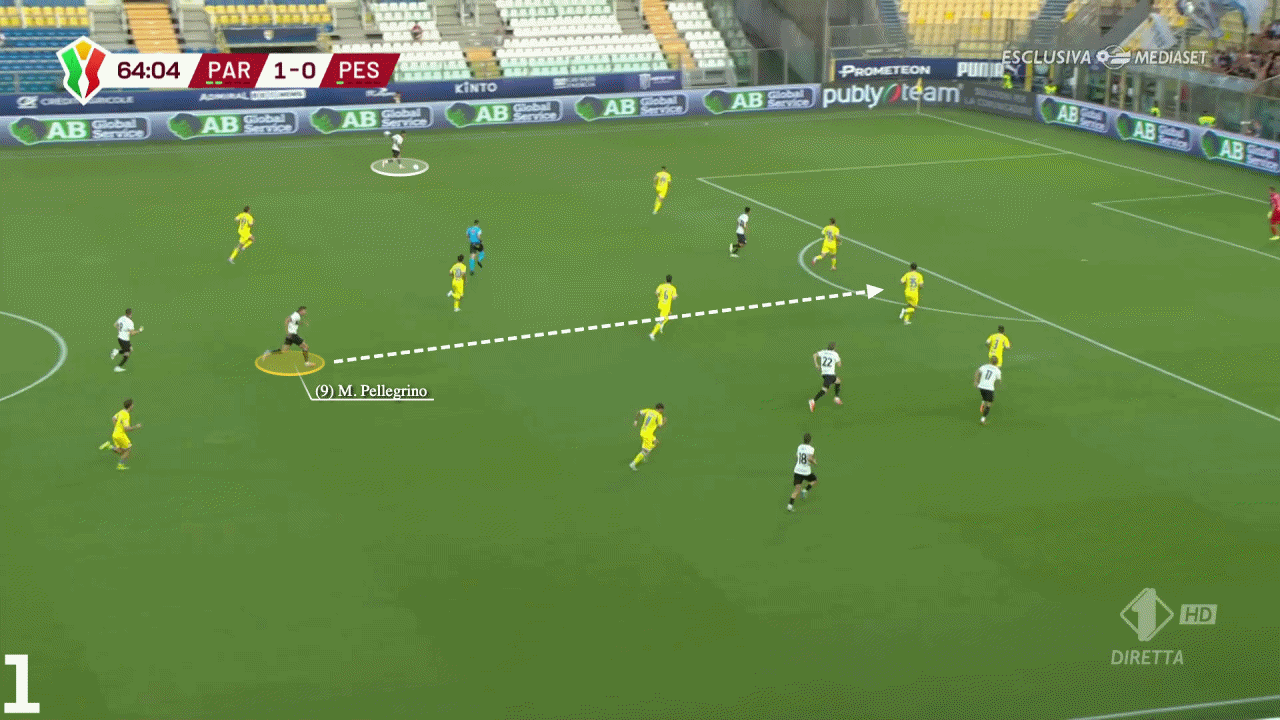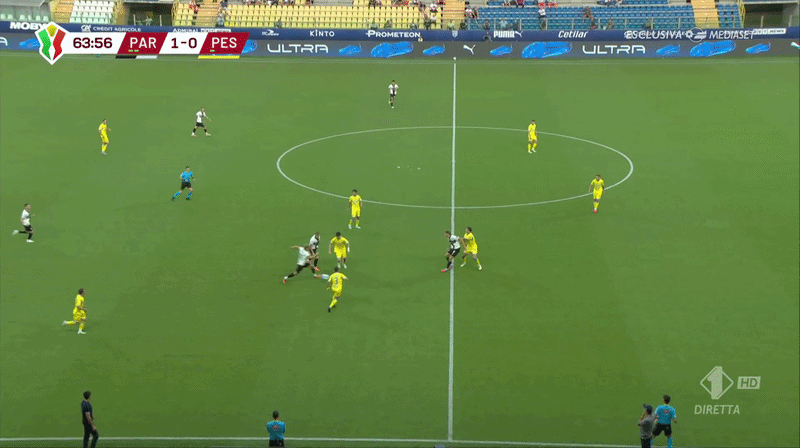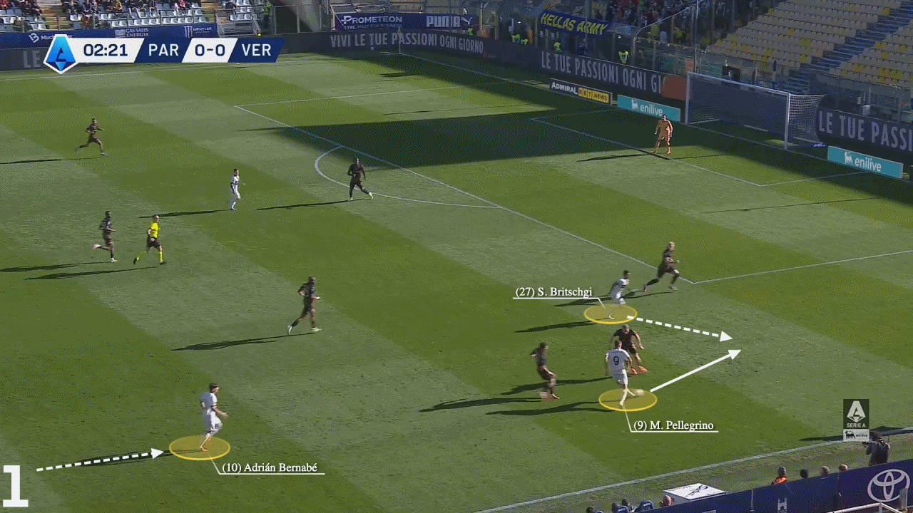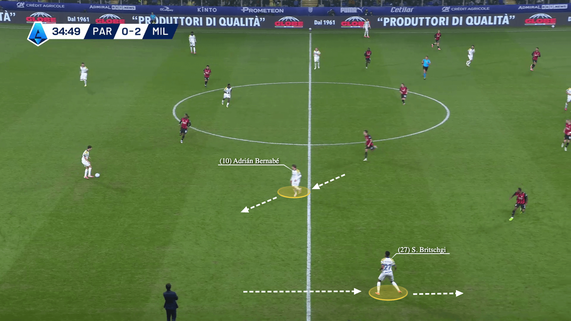 El delantero centro selecciona a Britschgi, quien encuentra a Bernabé. Centro hacia la izquierda, permitiendo al Parma avanzar en el campo como equipo.