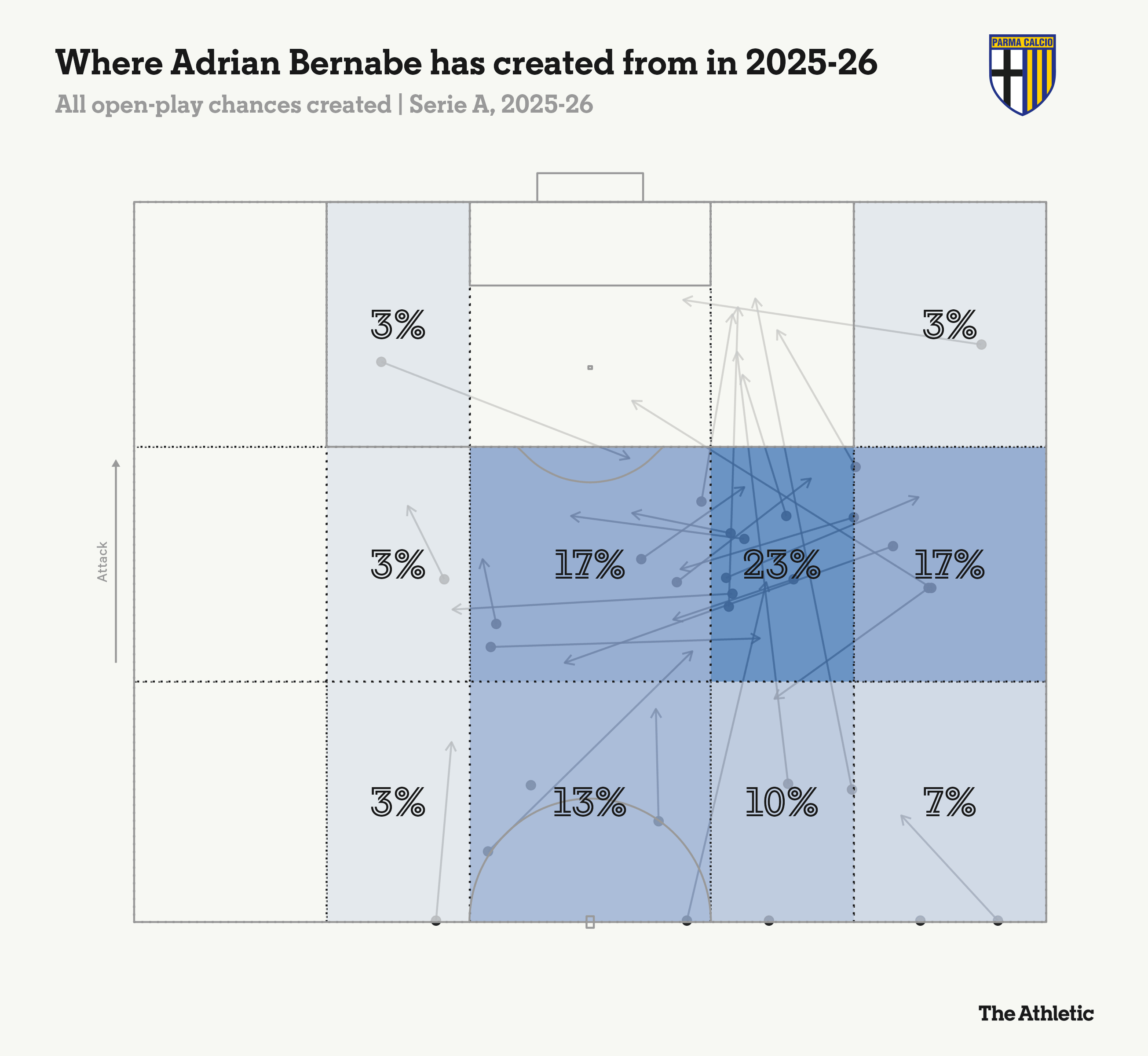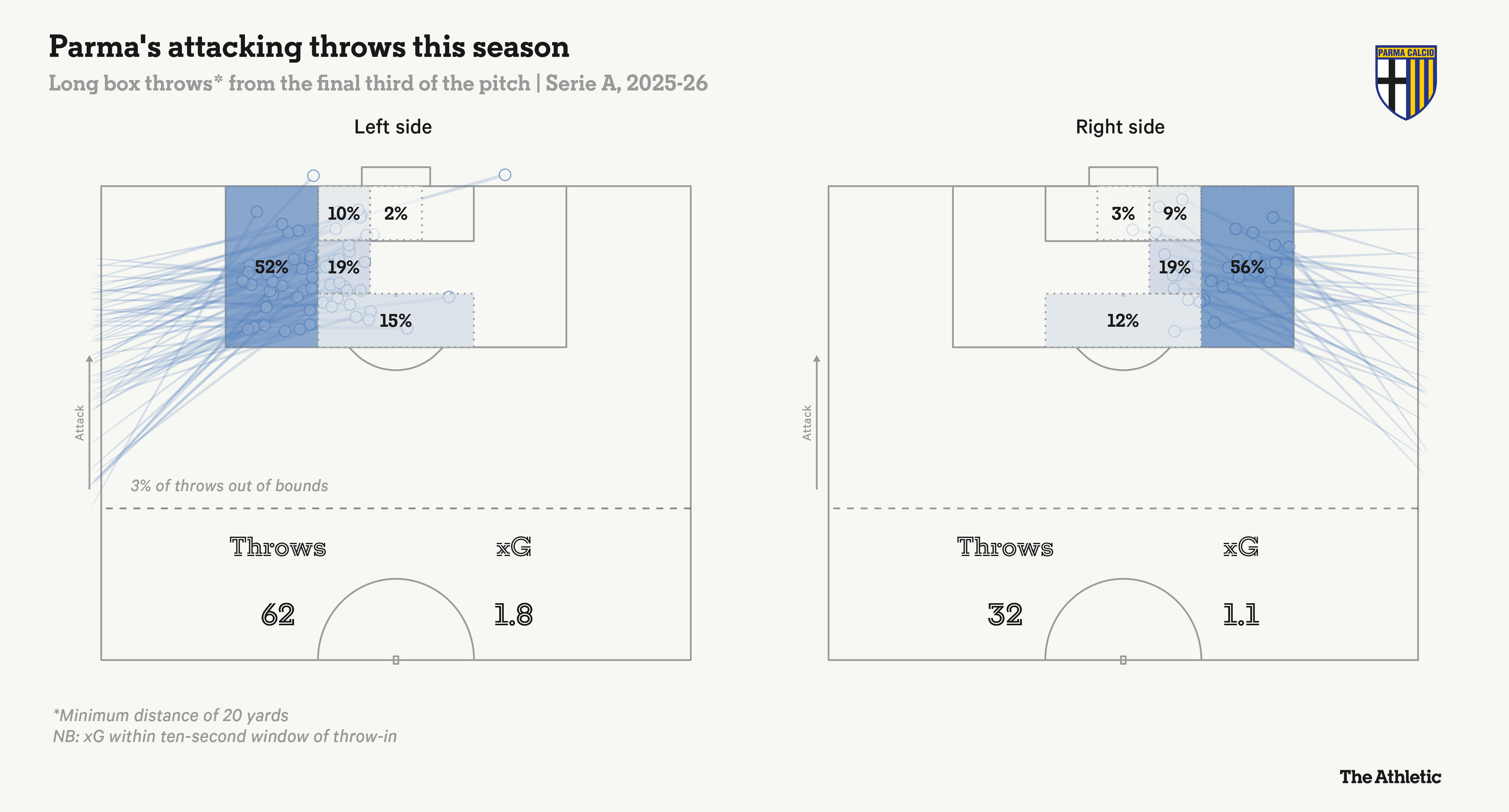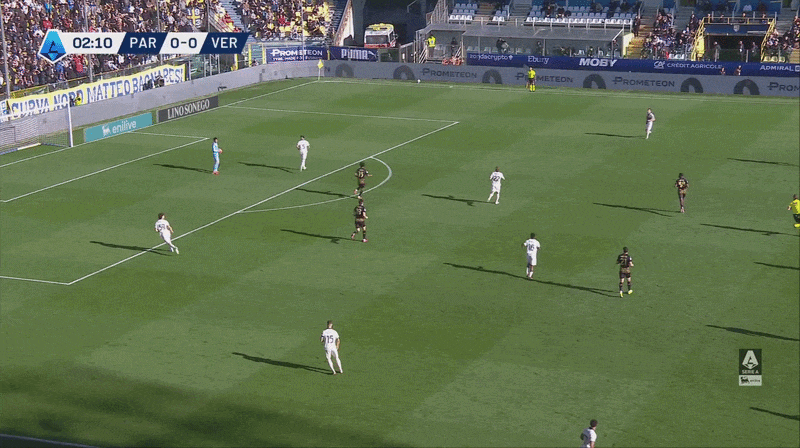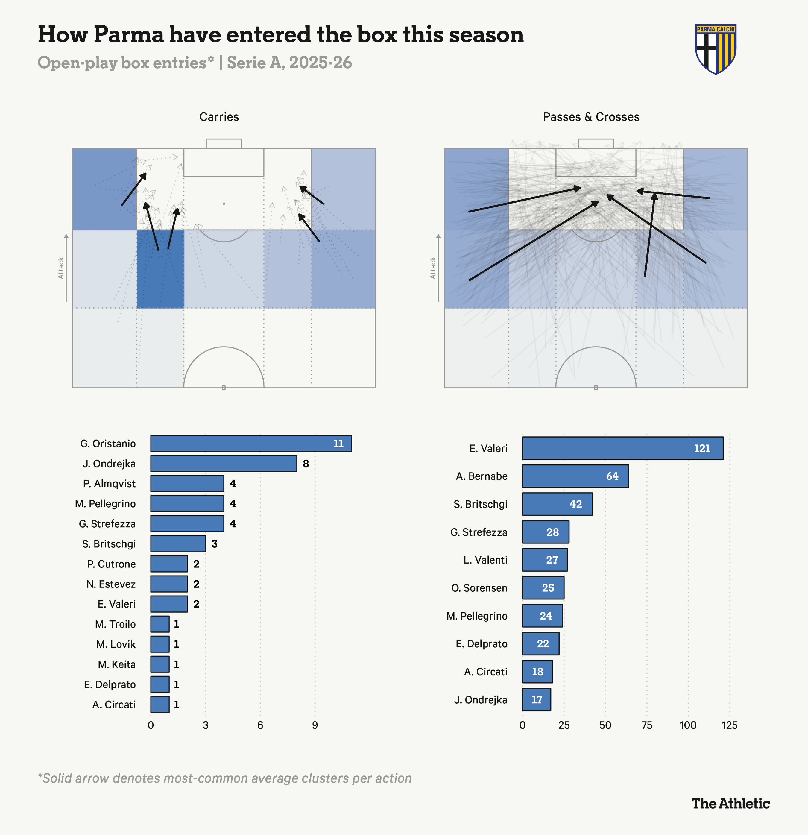 Valeri intentó 129 centros en el partido, segundo en la Serie A detrás de Federico Dimarco del Inter (149). En sus últimos 20 partidos, Parma ha promediado 14,4 centros por 90 minutos, lo que le sitúa en el sexto lugar de la división (frente a 8,9 por 90 en sus primeros 10 partidos, que le sitúan en el puesto 16). De esos centros, 4,1 de cada 90 fueron pases bajos, sólo superado por el Inter (4,6).
