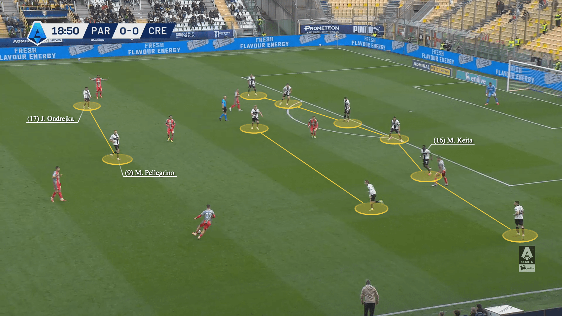 Parma retrocede cada vez más a medida que los oponentes avanzan hacia el tercio defensivo, pero mantiene a uno o ambos delanteros más arriba en el campo para que tengan una salida para los contraataques. Abajo, Keita se une a la defensa de cinco, con los otros dos mediocampistas cerca, pero Pellegrino y su compañero líder Jacob Ondrejka se mantienen alejados.