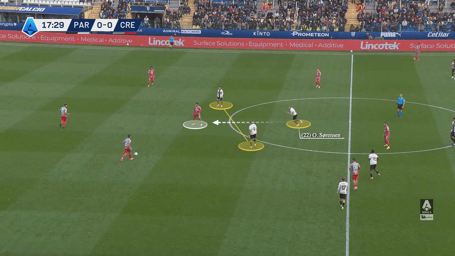 En los 20 partidos transcurridos desde entonces, han ganado 2,7 terceras posesiones ofensivas por cada 90, ubicándose en el puesto 19, mientras adoptan un enfoque más pasivo. El siguiente ejemplo, de la derrota en casa por 2-0 ante el Cremonese en su partido más reciente, muestra a los delanteros manteniéndose estrechos para presionar cuando los oponentes cortan fuera, mientras que el mediocampista Oliver Sorensen es capaz de empujar hacia arriba cuando es necesario.
