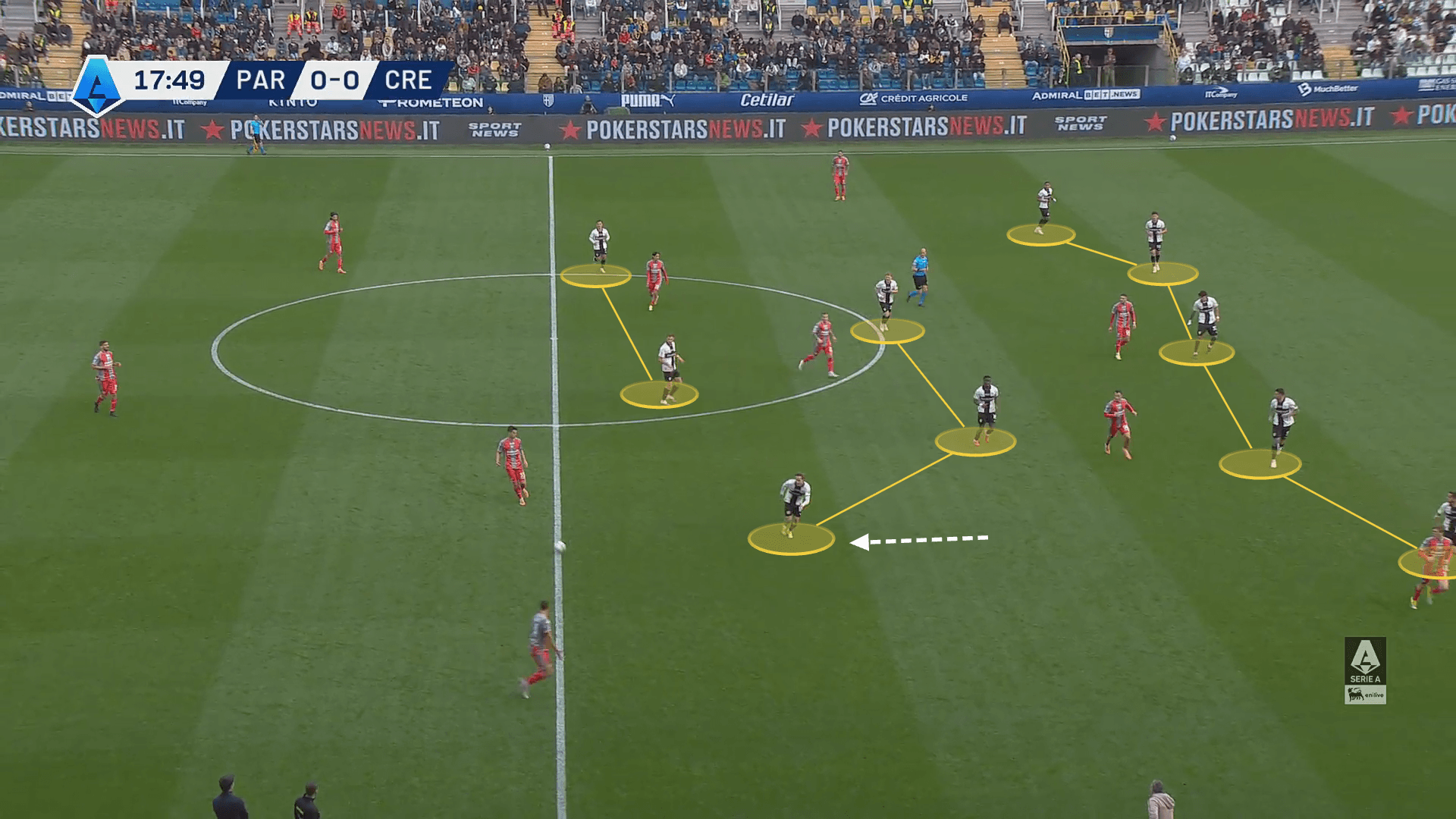 Mientras los Cremonese circulan la posesión, el Parma vuelve a adoptar una forma de 5-3-2 para forzar a su oponente a abrirse: los 17,3 centros en juego abierto concedidos cada 90 minutos son la mayor cantidad en la Serie A.