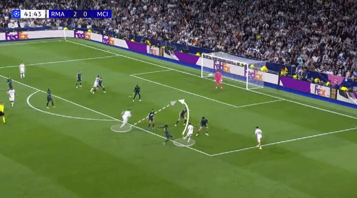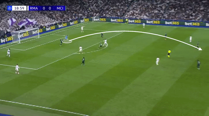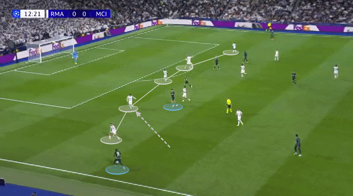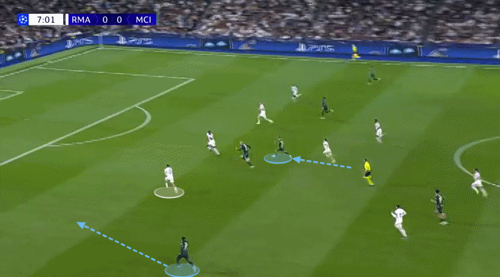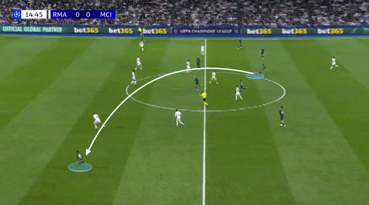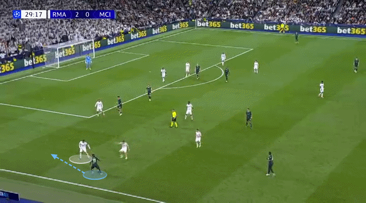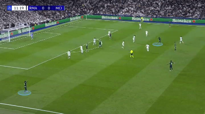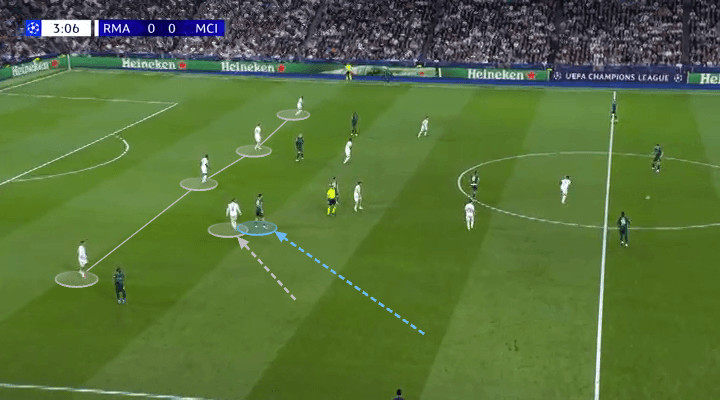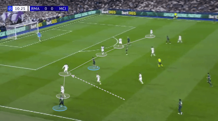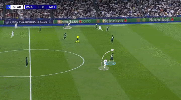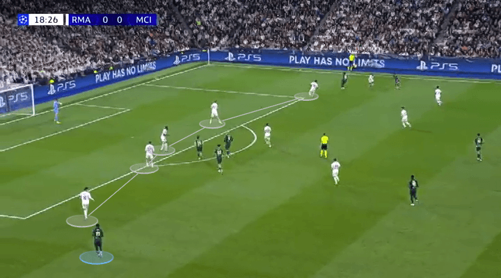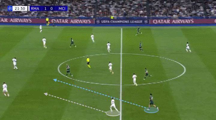 Mientras defendía como lateral izquierdo, O’Reilly actuaba como mediocampista central cuando el City tenía la posesión. Naturalmente, esto provocó que Federico Valverde, centrocampista derecho del Madrid, le siguiera dentro.