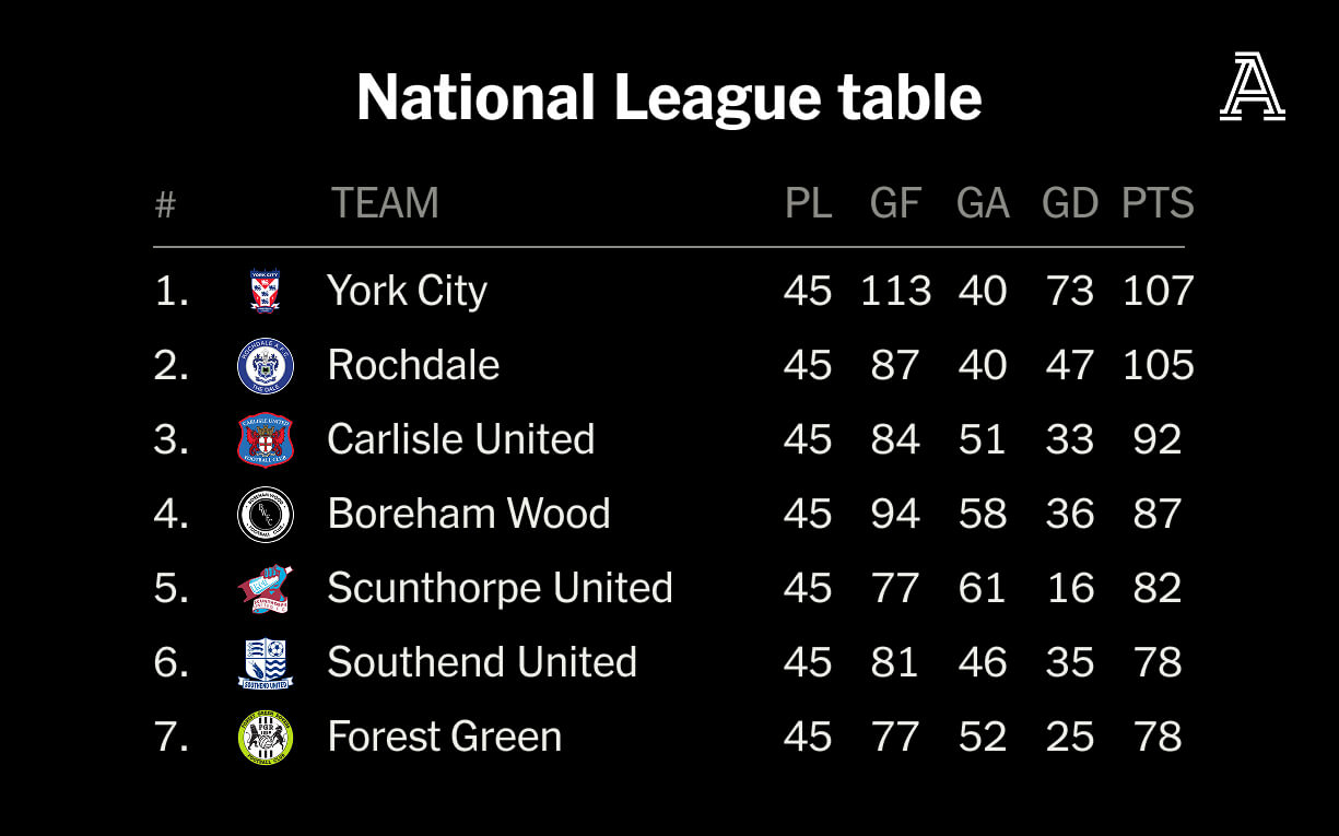 A pesar de la agitación, todavía no han conseguido el ascenso, porque sólo hay una plaza automática en la liga nacional y Rochdale está justo detrás de ellos con 105 puntos, 87 goles marcados y una diferencia de goles de +47.