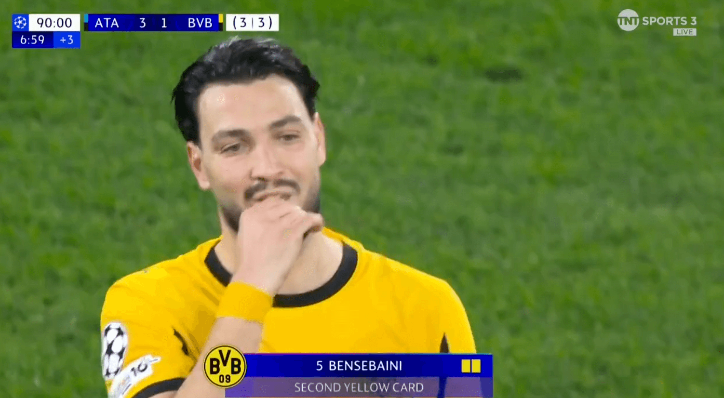 El defensa del Dortmund Ramy Bensebaini acabó recibiendo una segunda tarjeta amarilla por improvisación, al despejar un centro por la izquierda pero al mismo tiempo cabecear a Nikola Krstovic del Atalanta.