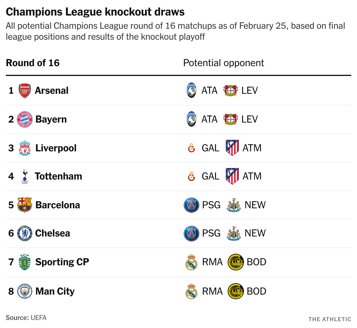 El sorteo de los octavos de final se llevará a cabo el viernes a las 11:00 GMT (6:00 ET) en Nyon, Suiza, y los partidos de ida y vuelta tendrán lugar los días 10 y 11 y 17 y 18 de marzo.