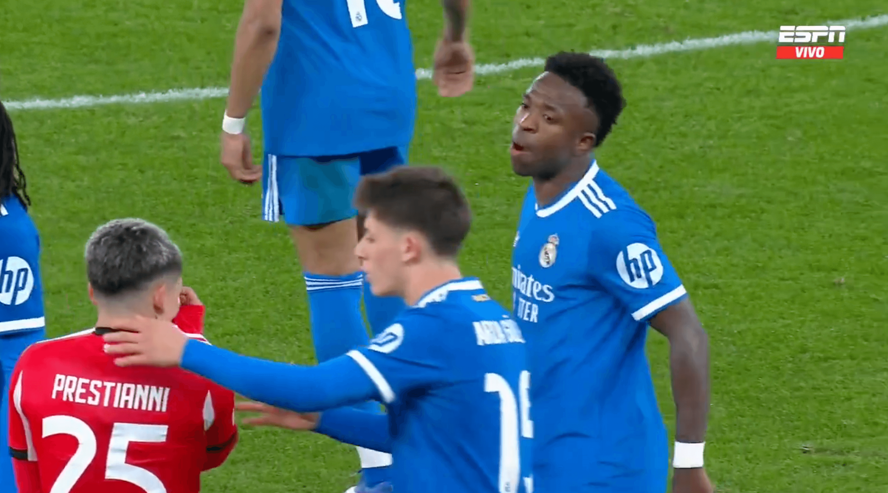 El extremo del Benfica Prestianni estaba entre los jugadores del Benfica que parecían descontentos y el argentino continuó hablando con Vinicius Jr mientras los jugadores regresaban a sus propios campos para reanudar el juego.
