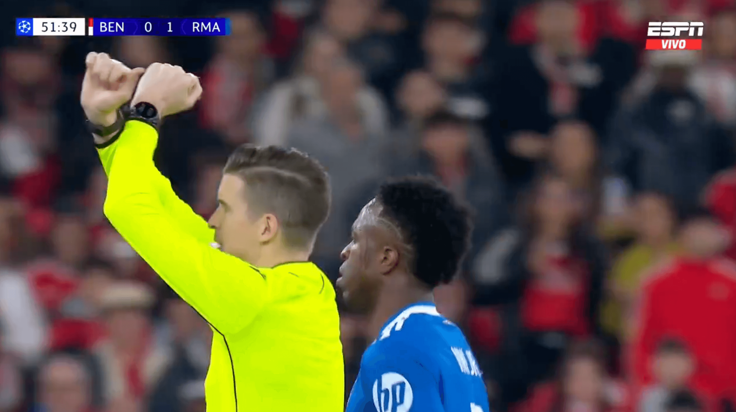 El árbitro Francois Letexier hizo un gesto activando el protocolo antirracismo de la FIFA después de que Vinicius Jr se acercara a él, tras lo cual el delantero abandonó momentáneamente el campo.