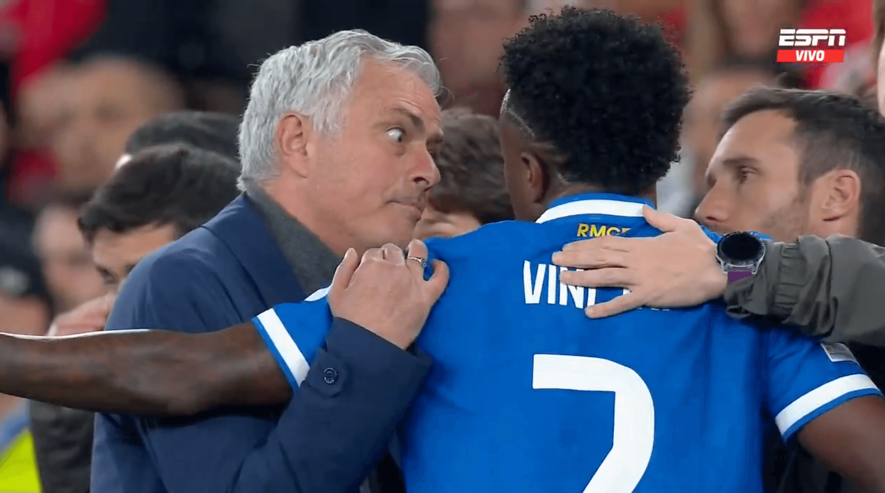 Mourinho rodeó con el brazo a Vinicius Jr para conversar estrechamente en la línea de banda, y el jugador de 25 años pareció decirle al ex técnico del Madrid lo que creía que le habían dicho.