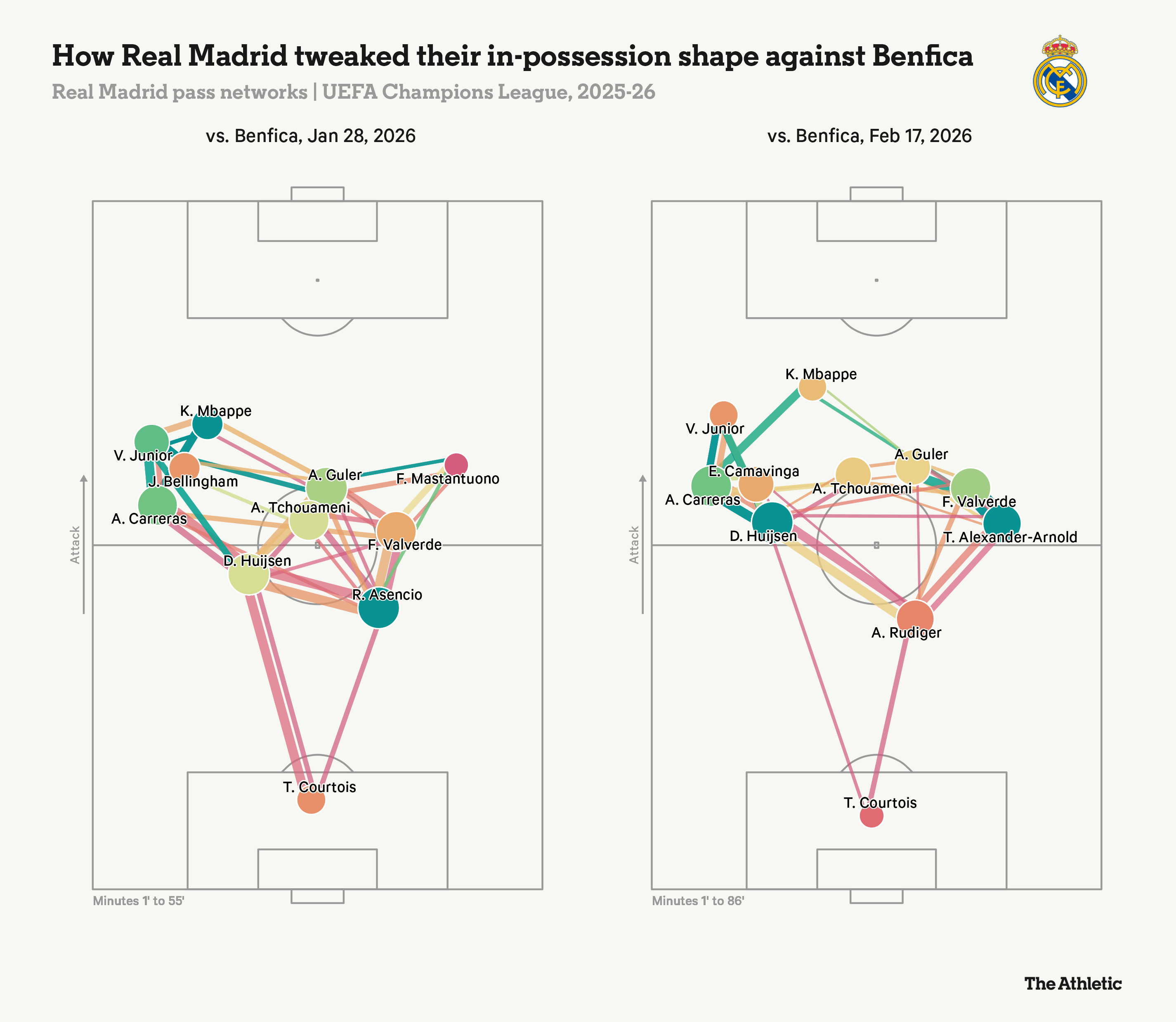 Sin balón, el Madrid jugó con su habitual 4-4-2, aunque sus dos filas de cuatro se vieron reforzadas por la presencia de Eduardo Camavinga en el flanco izquierdo del centro del campo. Intercambió lugares con Carreras y en ocasiones se movió hacia el centro para ayudar a Tchouameni, aportando atletismo y tenacidad defensiva al ala. En el otro extremo, un tercer jugador atacante, Franco Mastantuono, fue eliminado, lo que permitió a Valverde ocupar una posición amplia en el mediocampo y fortalecer la forma de un equipo que no tiene la posesión.